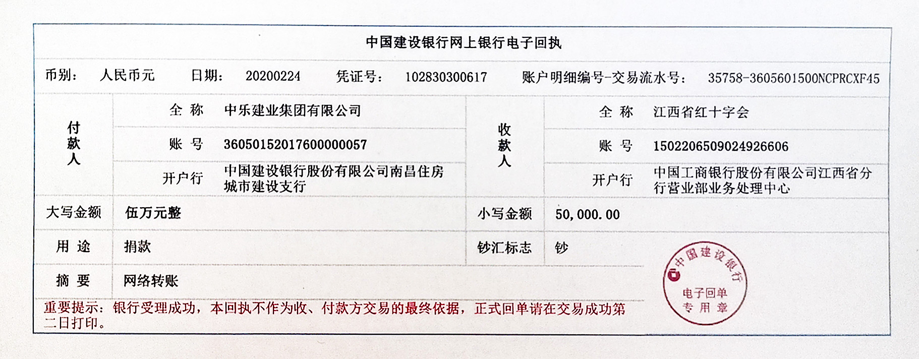 疫情當(dāng)前,正是守望相助的時刻。2020年2月23日中樂建業(yè)集團(tuán)有限公司向省紅十字會捐贈特制防護(hù)服120件,價值2萬元。次日再捐款5萬元。用于抗擊疫情,將溫暖直送最需要的地方。用實際行動表達(dá)企業(yè)與政府共同抗擊疫情的決心,為打贏這場無硝煙的疫情防控戰(zhàn)貢獻(xiàn)了自己的一份綿薄之力。